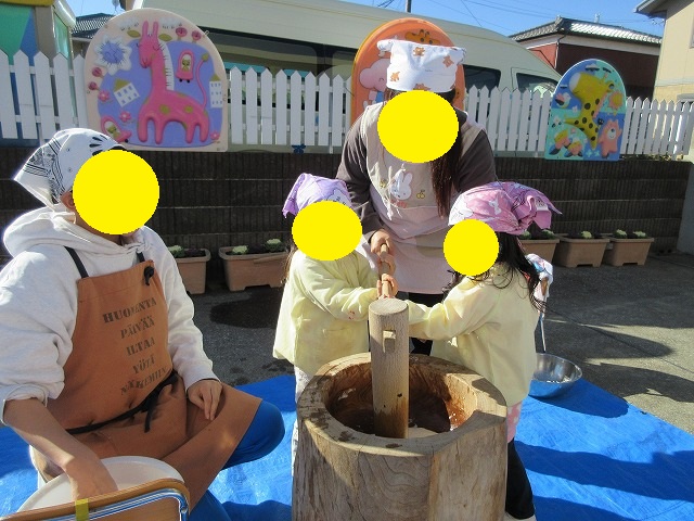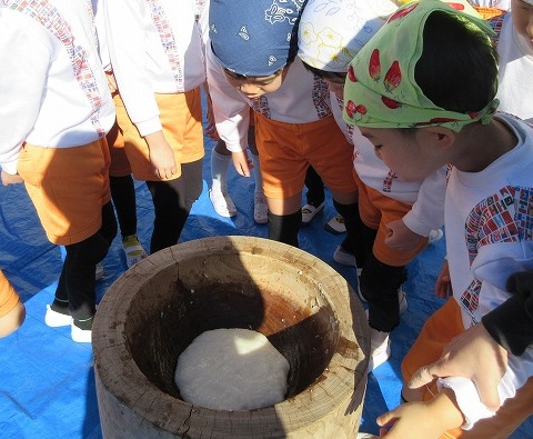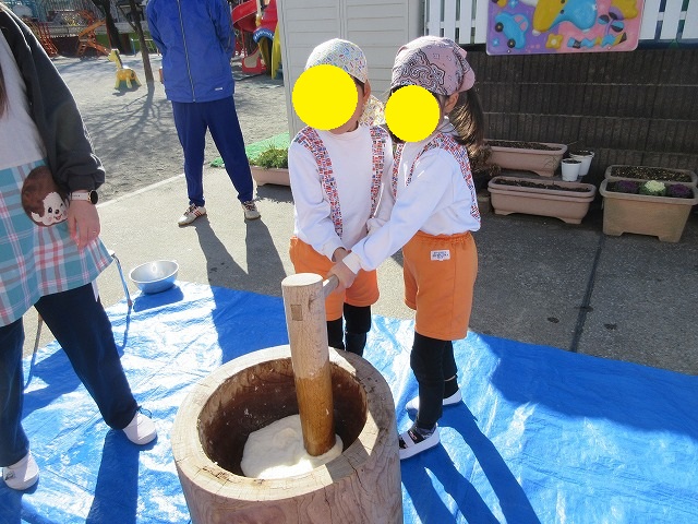 臼と杵を目の前に、子どもたちの元気な「ヨイショ!」という元気なかけ声が園庭いっぱいに響き渡りました。蒸したもち米の香りを感じたり、少しずつおもちに変わっていく様子を興味深そうに見つめたりしながら、日本の伝統行事を身近に感じることができた一日となりました。